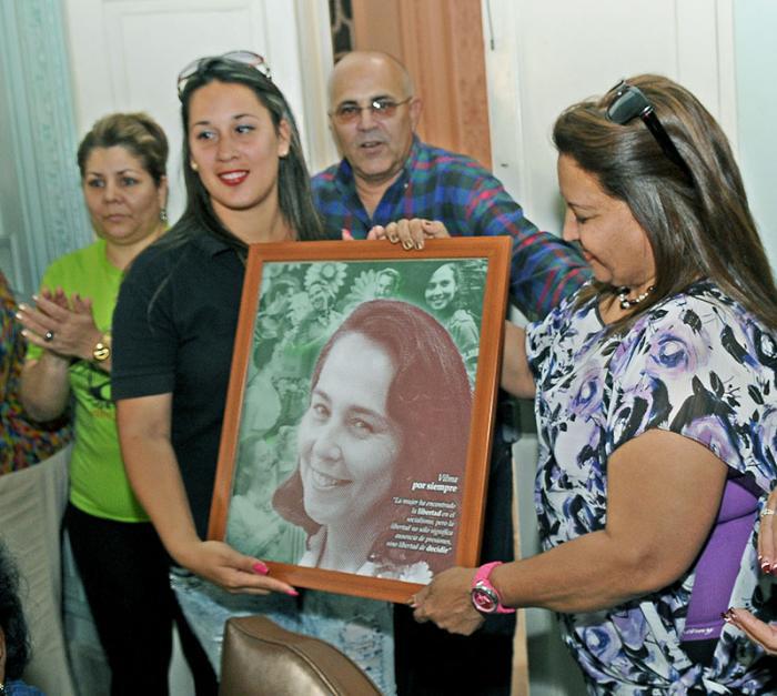 La segretaria generale della FMC, Teresa Amarelle Boué, ha ricevuto in regalo un quadro con il ritratto di Vilma Espín, che le è stato consegnato a nome della famiglia dei CDR.