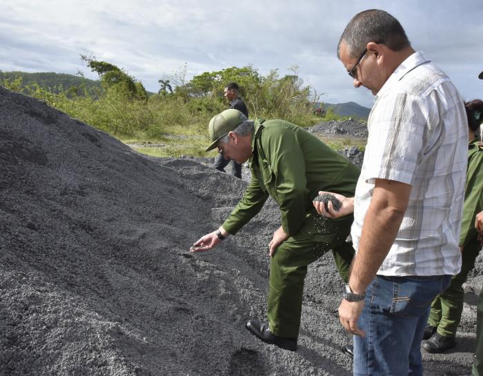 Il Presidente è giunto alla cava di Pons —che deve il suo nome al villaggio del municipio de Minas de Matahambre dov’è ubicata, prima di dirigersi a Minas. Con l’arena, il granito e la ghiaia che si producono qui, si riforniscono sei municipi della provincia, fondamentalmente quelli della zona di montagna.