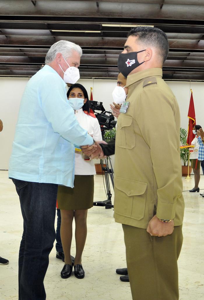I membri del Burò Politico del Partito, Teresa Amarelle Boué e Ulises Guilarte de Nacimiento, segretari generali della Federazione delle Donne Cubane e della Centrale dei Lavoratori di Cuba, rispettivamente, hanno imposto la medaglia José Antonio Echeverría a 13 studenti.