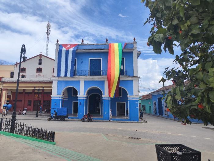 Una bandiera arcobaleno a favore delle cause della comunità LGBTIQ+ è stata spiegata sulla facciata della Casa di Cultura nel centrale parco Serafín Sánchez, dove si manterrà sino alla fine delle giornate.