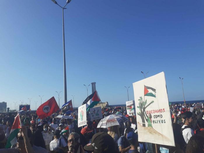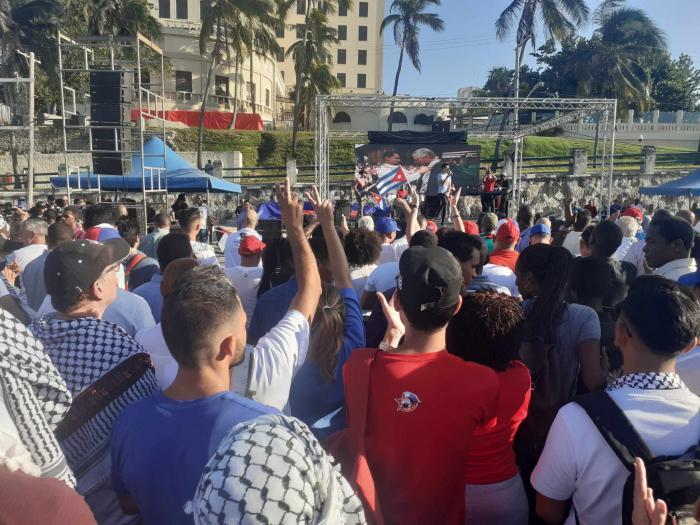 L’ordine della partenza lo ha dato Raúl Alejandro Palmero, Primo Segretario del Comitato Provinciale dell’Unione dei Giovani Comunisti (UJC) a L’Avana, lì nel luogo noto come La Piragua, uno studente palestinese e la Seconda Segretaria dell’organizzazione giovanile, Meyvis Estévez Echeverría, hanno ricordato i più di 10 000 morti tra i quali migliaia di bambini e di donne.
