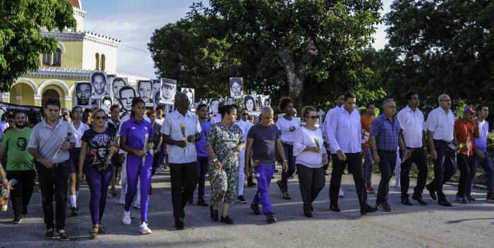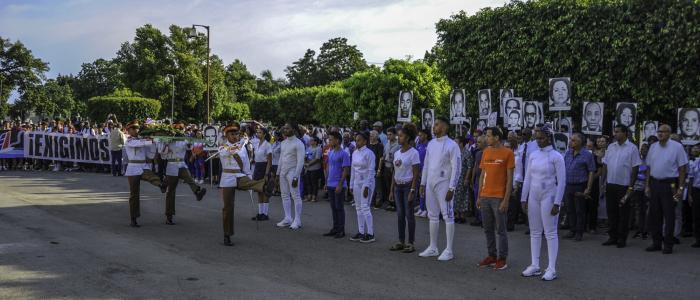 La cerimonia in onore delle vittime di questo crimine è cominciata con una commovente peregrinazione dalla chiesa del camposanto al pantheon delle Forze Armate Rivoluzionarie (FAR), dove sono stati offerti fiori a nome del Generale d’ Esercito Raúl Castro Ruz, leader della Rivoluzione Cubana, di Miguel Díaz-CanelBermúdez, Primo Segretario del Comitato Centrale del Partito e Presidente della Repubblica, del Consiglio di Stato e del popolo cubano.