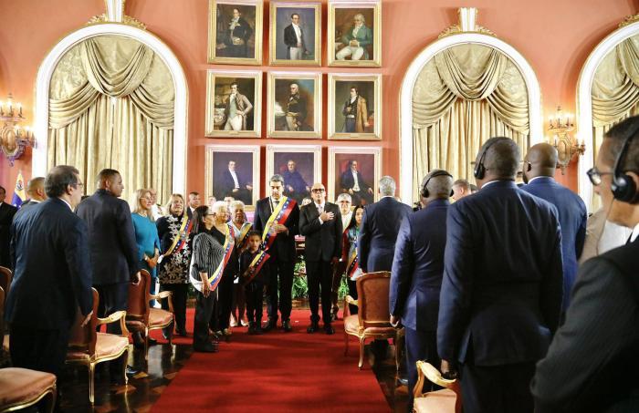 I rappresentanti di 100 delegazioni hanno assistito alla cerimonia del giuramento nell’ Assemblea Nazionale venezuelana, dove Maduro Moros ha segnalato:«Vengo dal popolo, sono del popolo e il mio potere emana dalla storia e dal popolo Il potere che rappresento e porto appartiene al popolo, e al popolo mi devo!».
