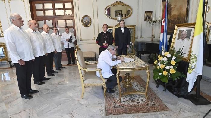 Il Generale d’Esercito Raúl Castro Ruz, leader della Rivoluzione Cubana, il Presidente della Repubblica di Cuba, Miguel Díaz-Canel Bermúdez e altri dirigenti, hanno firmato il libro di condoglianze nella Nunziatura Apostolica, con motivo della morte del Papa Francisco, in nome dello Stato, del Governo e del popolo di Cuba.