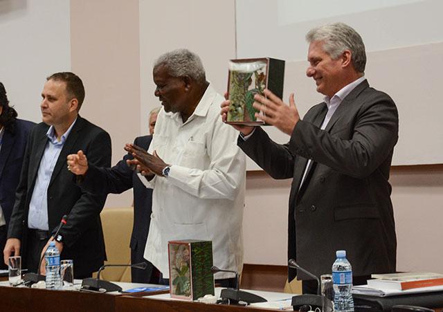 Per la Uneac è stato opportuno consegnare al Presidente cubano alcuni presenti, uno per il Generale d’Esercito Raúl Castro Ruz (opera di Lesbia Vent Dumois) e un altro per lui (opera di Ernesto Rancaño).