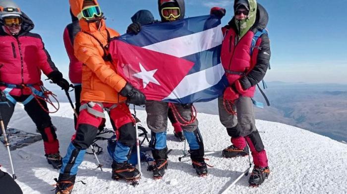 «Tre amici di Cuba hanno scalato il monte Elbrús, il picco più elevato dell’Europa ed hanno portato l’insegna cubana con una dichiarazione contro il blocco statunitense ad un’altezza di 5642 metri sul livello del mare».